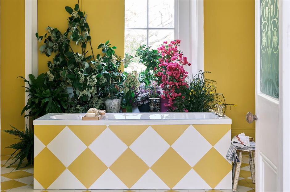A plain bath panel can be an ideal canvas to jazz up with paint. Here, the chequerboard floor tile pattern has been continued up onto the bath to create a continuous striking focal point of yellow and white diamond shapes.